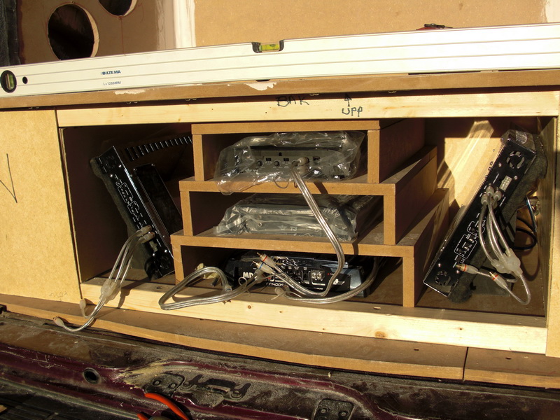 Vi meckade me lite allt möjligt som vanligt. Stjärnan slipade å hade sig en jädra massa på mittkonsolen så nu börjar den likna nåt. Per slipade å hade sig på själva backluckan så den nån gång kan bli klar för lite lack men det krävs ännu mer slipning å spackling av den innan det blir riktigt bra. Själv meckade jag med all kabeldragning till slutstegen. Det blev ju några kablar att dra då vi ska ha fem slutsteg så typ 5 ström å 5 jord kablar att dra. Fick även borra lite nya hål så att kablarna skulle räcka till rätt steg. Verkar som vi drog lite för korta kablar så fick förlänga en av dem men kan bli så vi får förlänga fler sen när vi ska koppla in stegen. Allt beror ju lite på hur slutstegen kommer stå. Men skönt att iaf ström å lågnivå kablarna har rätt längd. Så nästa meck tillfälle så ska jag koppla in alla steg å allt där bak. Dock testade vi ena steget idag med 10 tummaren i mittkonsolen. Det lät ganska okej trots vi inte skruvat fast talaren eller lagt i ljuddämpning i den lådan. Vi kunde konstatera att det lär låta fett mycket me 12 till basar som ska kopplas in :-P Men det märks också att typ allt i bilen kommer skallra men vi får försöka komma på något bra sätt att få tyst på det.